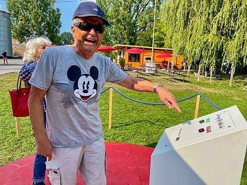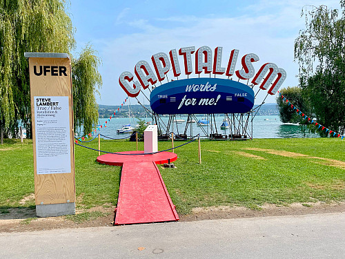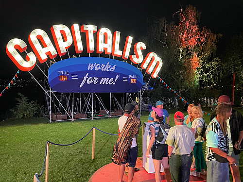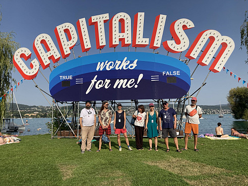 Professor Steve Lambert’s Capitalism Works for Me! True/False installation at the Aug. 2025 Zürcher Theater Spektakel in Zürich, Switzerland