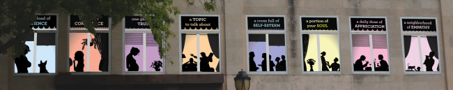 For the first time, the project included second floor windows. For her setting of the poem Recipe for a Loving Community, Madeline Friedman designed suggestive silhouetted scenes for each of nine sets of second floor windows at 131 Mamaroneck Ave, “inviting the public to engage their imagination and enter the world of the inhabitants.”