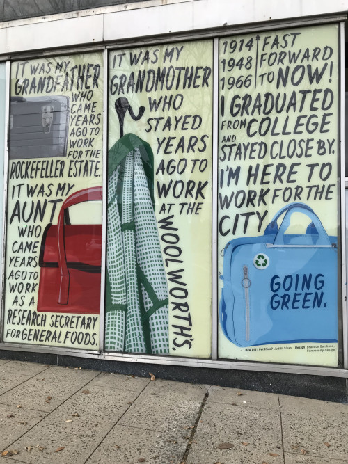 This year, as in the last three years, Professor Warren Lehrer worked with his Community Design class to populate the storefronts with visual poetry as part of their work for the semester, which focuses on pro-bono work to better the community. Eight students worked together to transform six vacant storefronts on South Broadway.