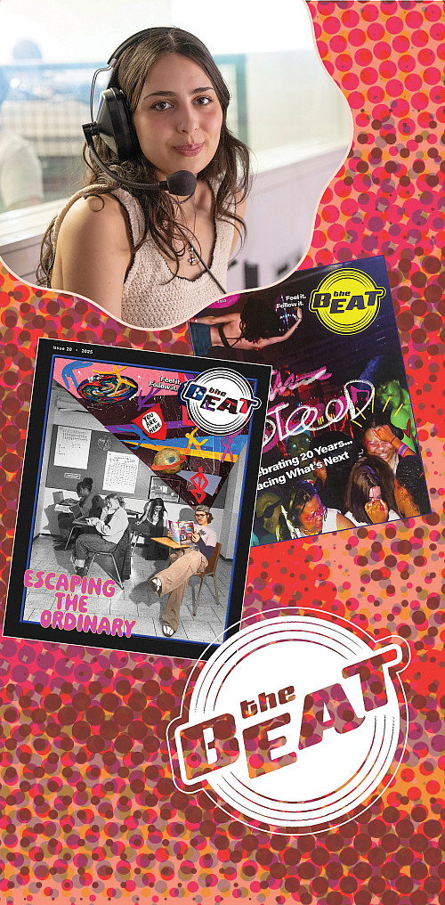 Approximately 10 to 20 students take Salomon’s course—The Beat : Magazine Production—to produce digital content in the fall semester. Spring is dedicated to publishing a print edition. Last spring, The Beat ’s Editor-In-Chief was Sophia Castro-Astor ’25 (Journalism). After years of working on the publication, she had a bold and ambitious idea for her final issue: to redesign the magazine as part of her senior project.
