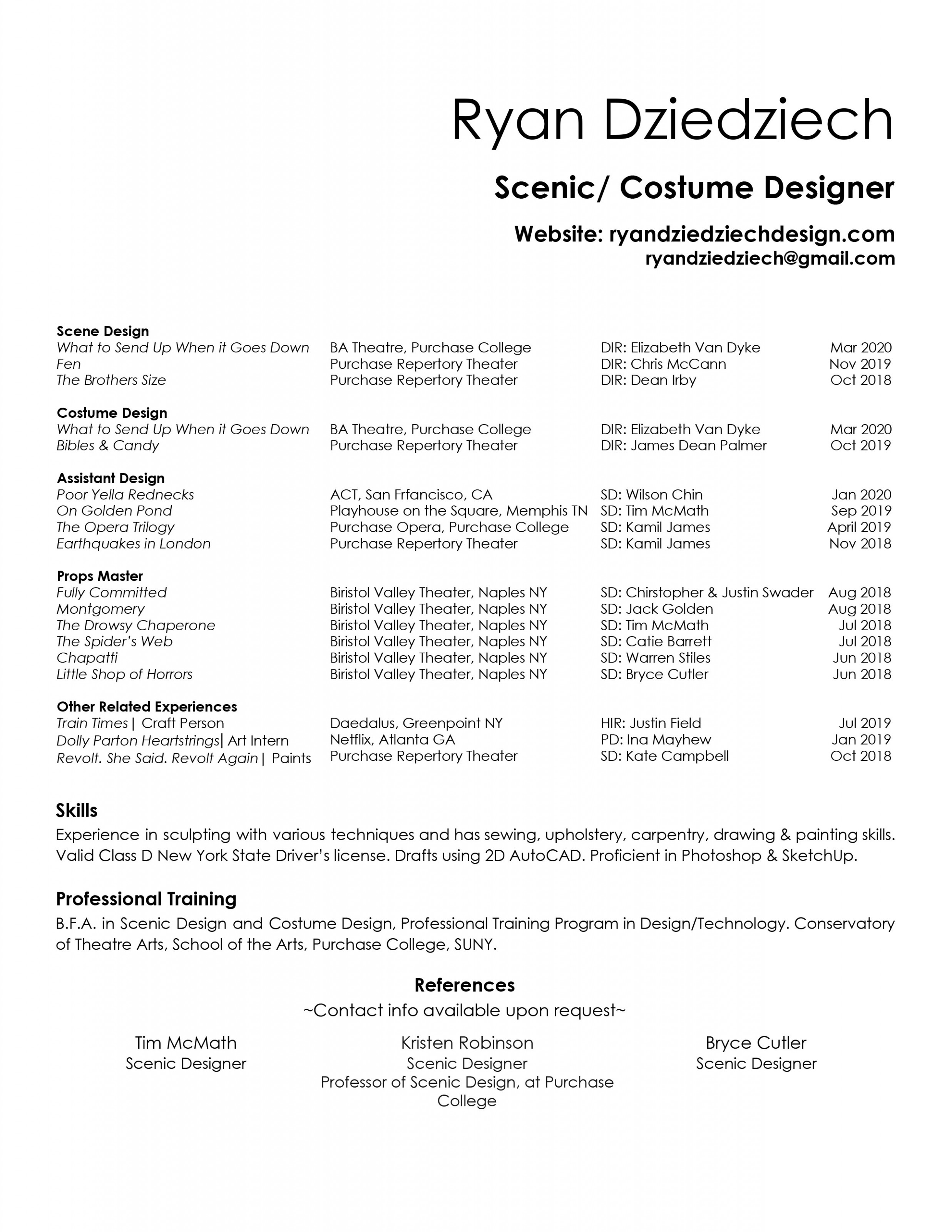 As a dual scenic & costume designer, I wish to have a career that stimulates me creatively, provokes me continually, and nourishes me artistically. I seek out design challenges to solve as if I’m a detective. Through collaboration & research, I learn the answer that lies deep within the heart of a play. The unique circumstances of every narrative are what inspire me. I respond to the constraints of a limited amount of time, resources, and space and aim for each story I tell to be distinct from any previous iteration.